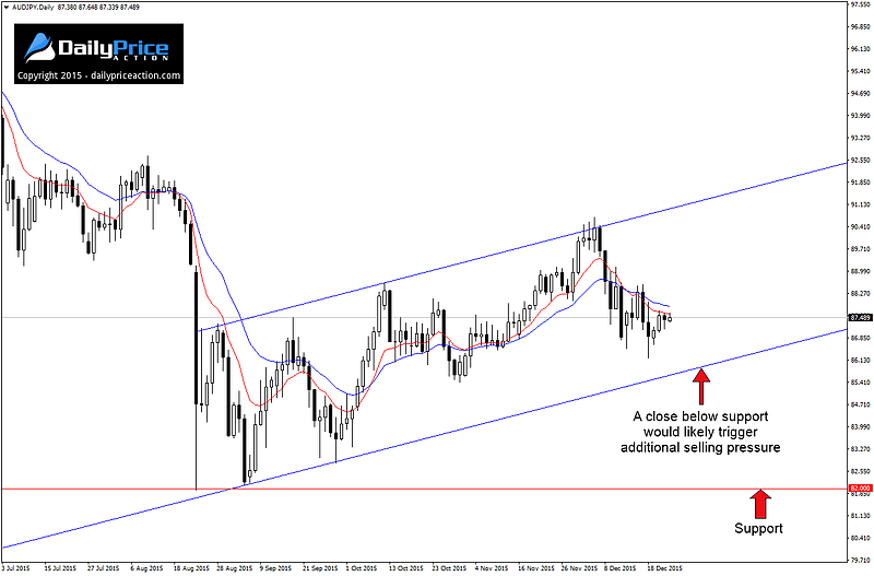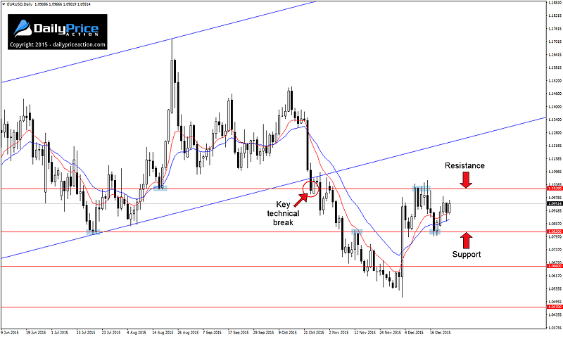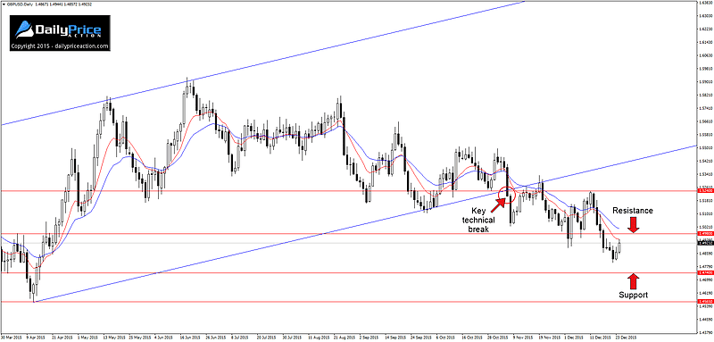 From here, traders can watch for bearish price action on a retest of this area as new resistance. Do keep in mind that the shortened holiday week will make liquidity hard to come by, so I don’t expect to see much in the way of movement until the first full week of 2016.