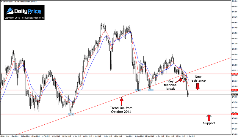 Those who sold GBPJPY after the pair closed below the fourteen-month trend line are enjoying open profits in excess of 400 pips at the moment. And if last week’s price action is any indication, this move lower is just getting started.