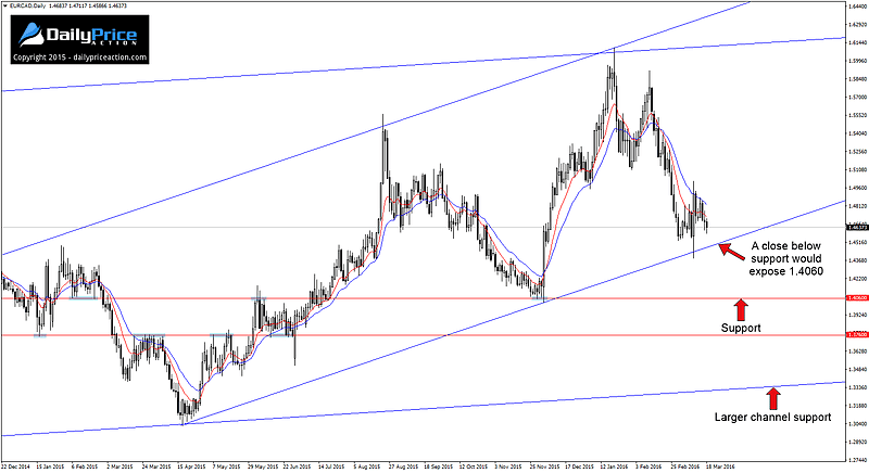 Keeping with the “simple theme”, a close below the smaller channel’s support would expose the 1.4060 handle and possibly the larger channel’s support near 1.3400. As always, the daily chart below does a better job of illustrating the implications of such a break.