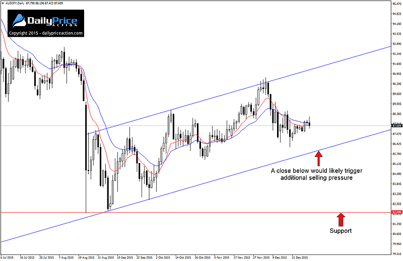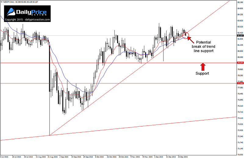 NZDJPY has started to receive a lot of attention of late as the last trading day of 2015 appears to have broken below the trend line support level that we have been watching for several weeks.