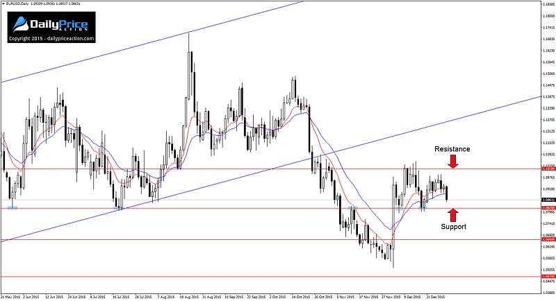 EURUSD finished 2015 in bearish form. Although the pair only lost 90 pips during the last trading week of the year, it failed to push above the December high at 1.1055. This alone indicates weakness that could trigger a move lower in the coming sessions.
