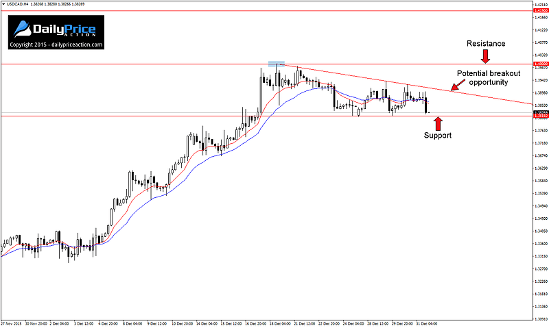 USDCAD could give us an opportunity to get long in the coming sessions based on the 4-hour wedge that has been forming since the December high was carved out at 1.40.