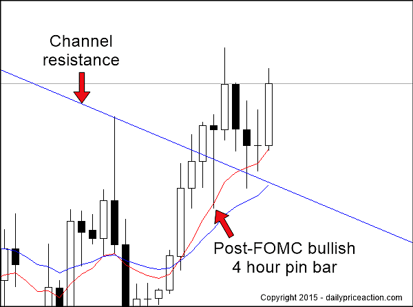 Now for the details of the setup. It started just before yesterday’s FOMC statement as the pair broke above channel resistance on a 4 hour basis. By the time the dust settled at the end of the US session we had a bullish pin bar rejecting former resistance.