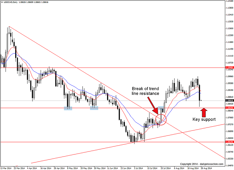 The key support area in this case is 1.082, which is represented by lows in both early and late May. The level also acted as resistance on July 25th and July 28th immediately following the break of trend line resistance.