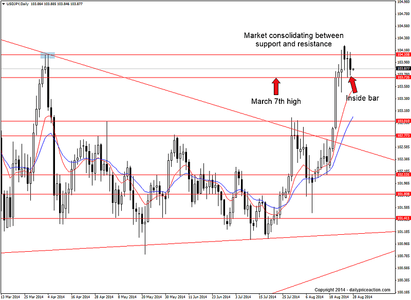 Summary: Potential to trade today’s inside bar on a break of the mother bar high from August 26th. However a safer bet is to wait for a close above 104.11 and then look for a long entry. The next key resistance comes in at the year open around 105.30.
