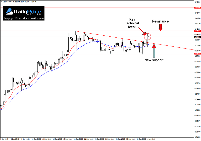Over the weekend, I mentioned the bullish wedge that has been forming on the USDCAD 4-hour chart for the past two weeks. In that commentary, I also noted that an opportunity to get long would only materialize on a close above wedge resistance.